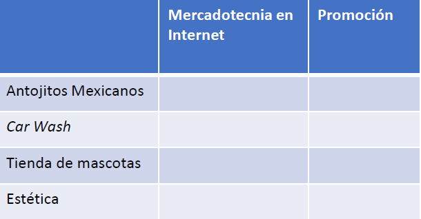 Observa los siguientes giros para negocios que se establecen en la tabla y describe qué técnica de la mercadotecnia en internet utilizarías para darlo a conocer y qué promoción implementarías para atraer a más clientes si fuese tu negocio:
